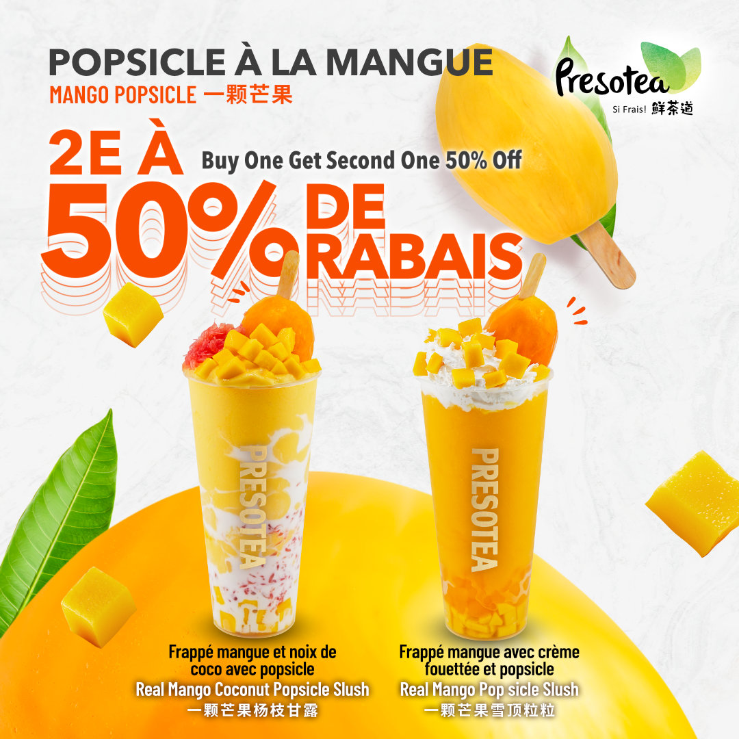 Photos à titre indicatif seulement. À l’achat d’une boisson de format régulier de la série Popsicle à la mangue, obtenez la deuxième (identique ou différente) à 50% de rabais. Supplément de 1$ par boisson pour le format grand. Garnitures en sus. Valide en magasin, aux bornes de commande et sur l’application Presotea Canada uniquement. Non combinable avec d’autres offres. Offre disponible dans certains établissements en ON, QC, N.-É. et N.-B. Tous droits réservés.