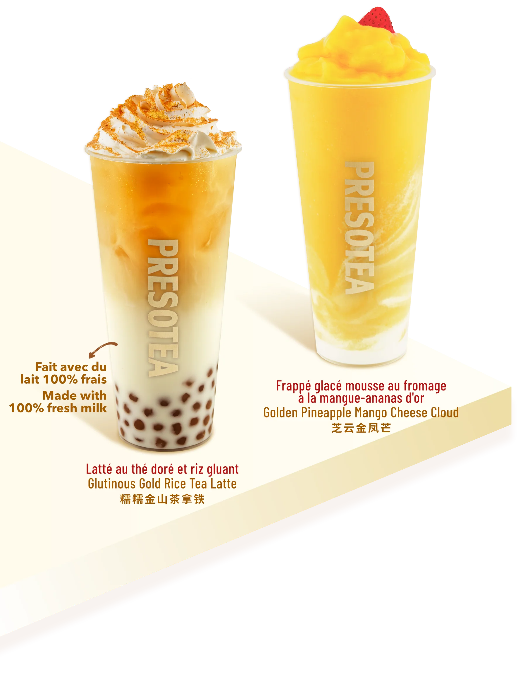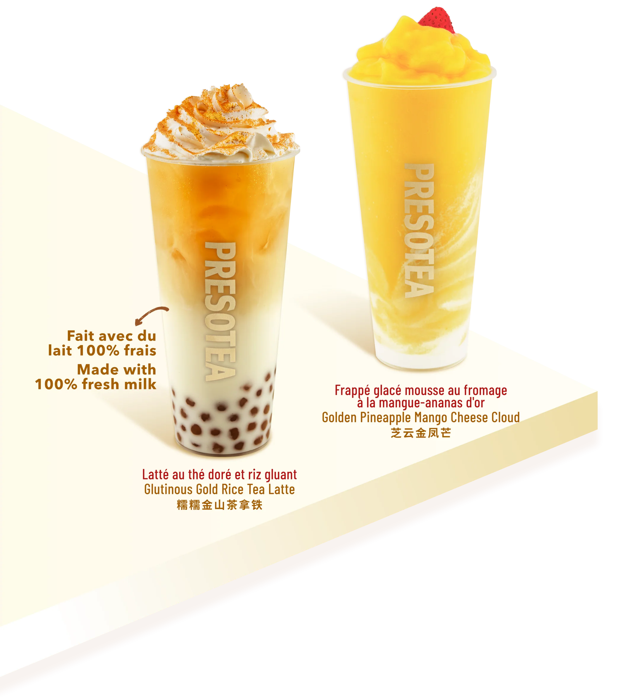 Les cadeaux en édition limitée sont offerts selon le principe du premier arrivé, premier servi, jusqu’à épuisement des stocks. Les commandes peuvent être passées au comptoir, à la borne en libre-service ou via l’application Presotea Canada. Uniquement dans les magasins Presotea participants en ON, QC, N-B et N-É.