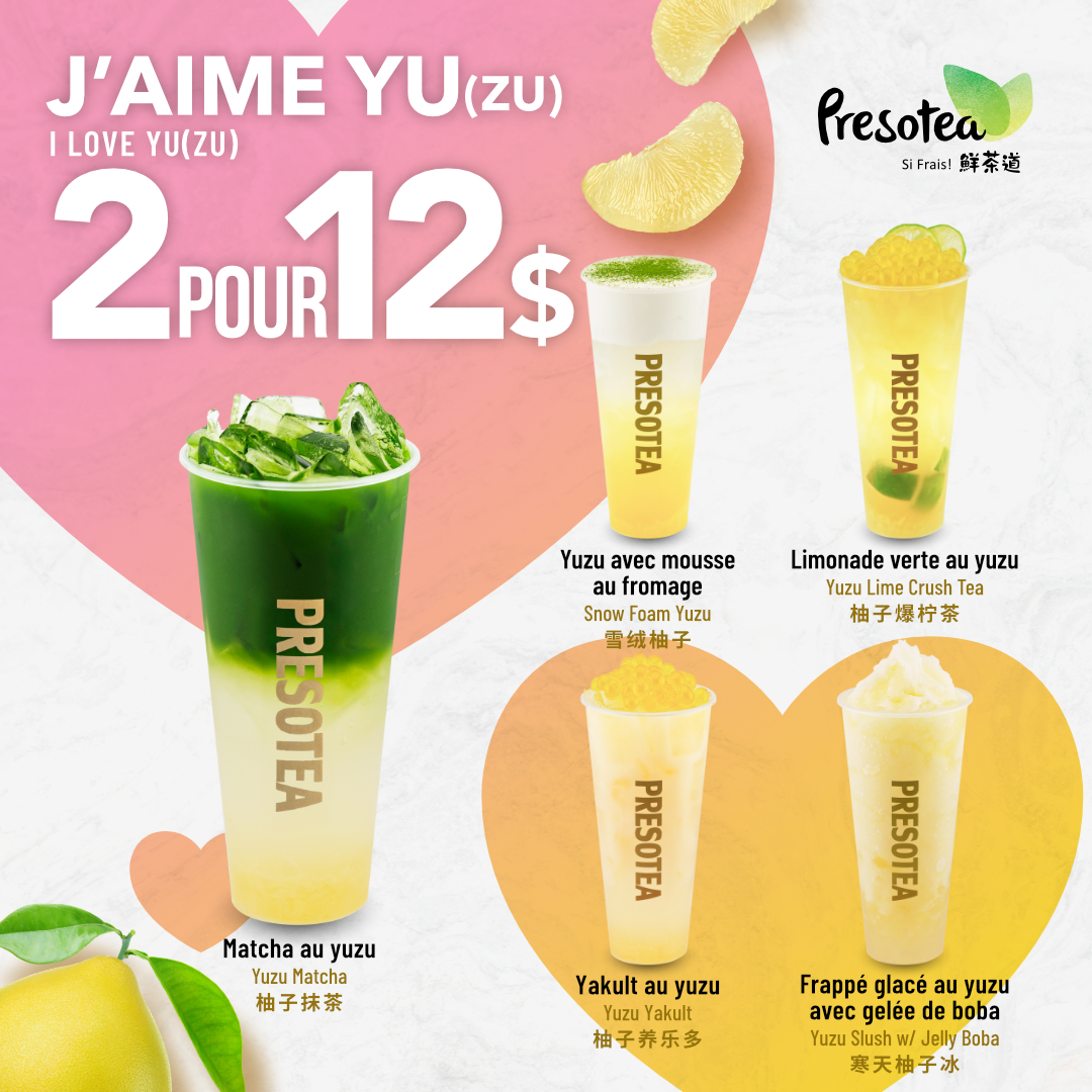 Achetez deux boissons parmi la liste ci-dessus pour 12 $+ taxes. Les garnitures sont en supplément. Format régulier seulement. Le grand format coûte 1$ supplémentaire par boisson. Achat en magasin et aux bornes de commande en libre-service seulement. Non cumulable avec d’autres offres. Disponible uniquement dans les magasins Presotea participants en ON, QC, N-É et N-B. Tous droits réservés.